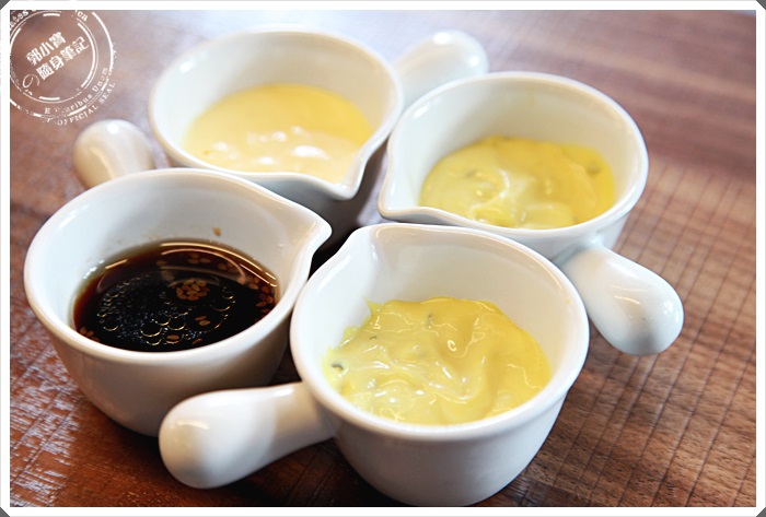 分別是義大利油醋醬、千島沙拉醬、蜂蜜沙拉芥末籽醬、和風香芒柳橙醬四種,PAN JT潘瑞宗手感的店的油醋醬我個人覺得調的還不錯,吃起來味道相當的解膩,也很清爽,香芒醬的部分不會過於甜膩。 |