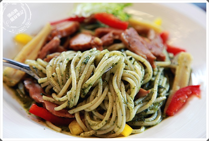 義大利麵給的量都算還滿足的,以單價150左右的義大利麵來說真的已經很划算又超值了,青醬的部分調的是我最喜歡的那種,是屬於比較重口味的九層塔濃郁香氣,雖然九層塔跟羅勒是同一個品種,但是還是有一些差別的,羅勒製作成青醬的味道比較內斂,但點香氣提升乾燒的味道而已,但是九層塔入口的香氣可就不是羅勒可以比的了,把九層塔直接打汁添油,青醬緊緊的巴住義大利麵,每一口都是濃郁青醬的味道。