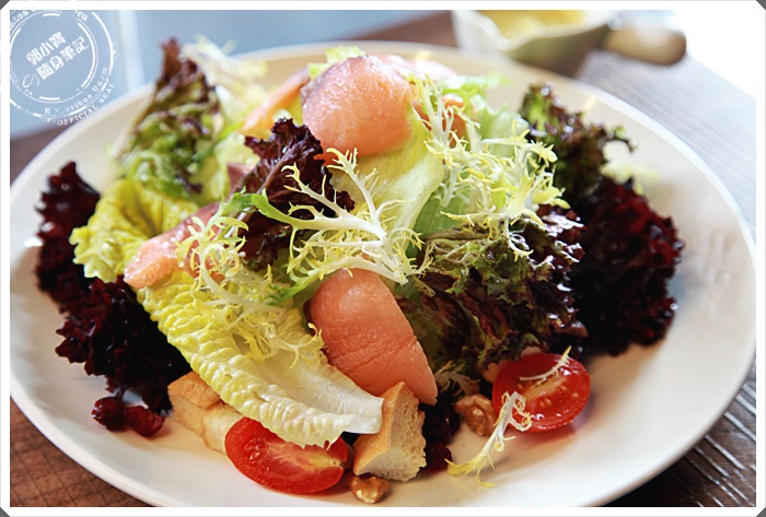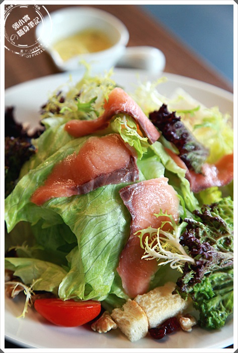 | 主題沙拉跟義大利麵的部分都在早上11點就開賣了,喜歡以沙拉果腹的女孩子也相當的適合來PAN JT潘瑞宗手感的店,這邊130大洋就可以吃到這麼一大盤的生菜沙拉,比起一般的早午餐店划算真的相當的多,煙燻鮭魚片挺新鮮口感也不賴,但是重點都還是後面的套餐的附餐飲料啊!!!!! |