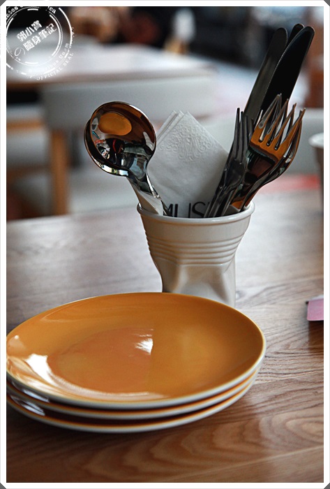| 點完餐後服務生就快速的幫我們送上了餐具,可能看我們點滿多餐點的,所以每個人還有一個小盤子,把她當成分享餐的概念來使用,只是裝餐具的杯子有點不穩,有時候拿一個刀叉一個重心不穩整個杯子就會打翻了。 |