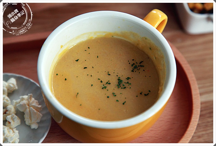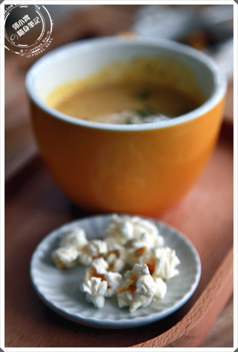 | 這一杯75大洋的玉米濃湯上來的時候我還真的笑了一下,真的是另類的玉米濃湯,一小碟的爆米花跟一杯濃湯,喝了一小口的濃湯後頗為讓我驚訝,這濃湯真的很好喝,有點像是日式暖湯的口感跟濃郁度了,喝的到那沙沙的蔬菜泥的口感跟濃郁香氣,入喉的溫潤感相當的令人滿足,難怪店家標榜著沒有套餐的概念,因為每一項產品真的都是真材實料穩紮穩打,這一碗75元的湯品值得妳單點她來喝上一碗。 |