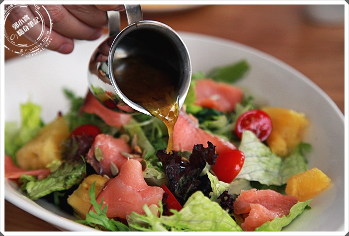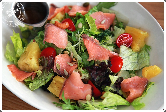 | 煙燻鮭魚的魚肉還滿大塊的且份量頗多,算是分量滿大的一份沙拉,MUSE調的油醋醬挺北部口味的,酸的比例拉的比較高但是卻不討人厭,比較適合女生的口味,煙燻鮭魚的香氣剛剛好,帶點淡淡的煙熏味提出魚肉的口感。 |