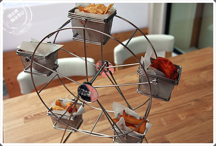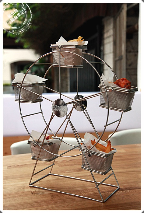 摩天輪是可以動的,也就是妳吃完下面那一籃的話,比較重的籃子自然會降到下面來,中間還有MUSE的英文字樣,這一份炸物下午茶總共有五種炸物相當的特別,我覺得這一份應該是男人們的下午茶,一整個就超適合配上冰啤酒的啊!!! |