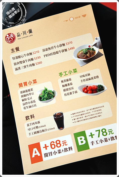 | 品川蘭的菜單也做得相當有質感,仔細看了一下菜單以後才發現,品川蘭的牛肉麵售價真的超平價的,跟一般在路邊攤吃的牛肉麵價錢幾乎沒有甚麼差別,除了牛肉麵以外還有提供排骨麵跟其他麵類,所以不能吃牛的朋友也可以一起來品川蘭。 |