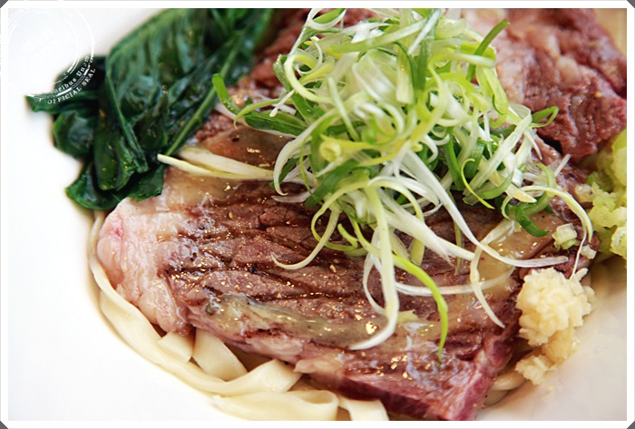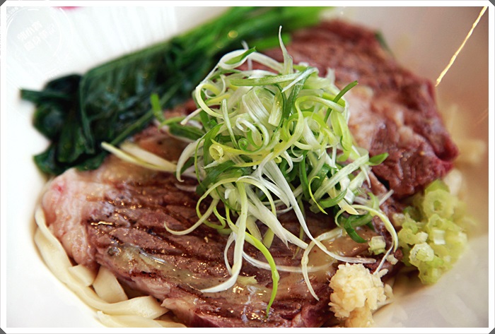 | 同行的大哥點了單價最高的肋眼牛排牛肉麵,一開始送上來的時候是還沒有加湯的,可以讓消費者完整的看到一整塊7盎司的肋眼牛排肉,炙燒的格紋狀相當漂亮,可以看到肋眼周圍滿滿肥嫩油花,光是到西餐廳點一份7盎司的肋眼牛排都應該不只500元了,在品川蘭可以吃到這樣的價位真的超划算!! |