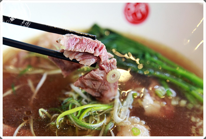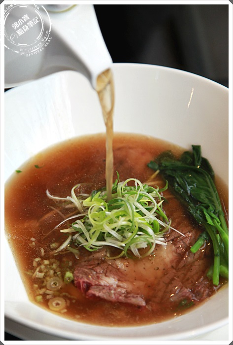 | 服務人員拿了一壺滾燙的湯汁倒入麵碗中,讓肋眼牛排只用熱水過一下,可以保有牛肉鮮甜的肉汁與血水,這做法倒是有點像是台南的牛肉湯,品質不好的牛肉是沒辦法這樣做的,可見得品川蘭對他們自家牛肉的品質相當有信心,這一碗牛肉麵我個人覺得比故宮博物院旁邊某飯店的牛肉麵好太多了,不管是牛肉的品質上還是湯色看起來都更具吸引力。 |