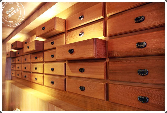 | 另一邊牆上為了避免太單調,還刻意裝潢成早期中藥鋪整個牆都是抽屜,其中幾個都還是拉開的感覺,搭配品川蘭想強調的所有的藥材跟原物料都是最費工的。 |