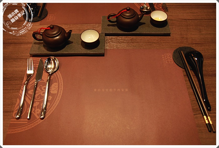一整個就是吃西餐的概念,右手邊是湯匙跟筷子,左手邊是叉子刀子跟湯匙再度+1,但是擺放的方式不知道跟西餐一不一樣是有順序拿的,從最外圍開始向裡面拿,對於炙牛食創堂這樣的用餐方式覺得還滿不賴的,台灣牛肉麵明明有名到國外去,利用外國人習慣的用餐方式來呈現,倒是一個全新的概念。 |