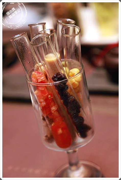 試管裡面放的是莎拉料,有番茄丁、奇異果町、葡萄乾、玉米粒、核桃五種配料,中間的試管是她們的醬汁,沙拉最重要的就是醬汁了!
