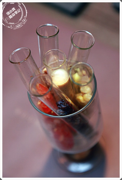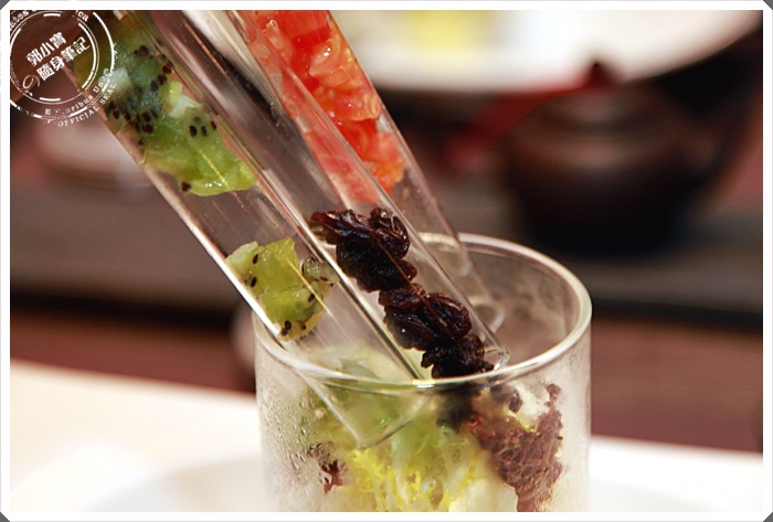 倒完五根試管的食材還滿費工夫的,因為有些水果丁會捨不得離開那麼時尚的試管,所以可能要用點力的把他搖出來,搖搖莎拉果然不是叫假的,從試管就開始要搖搖了XD |