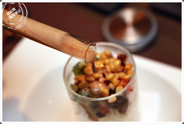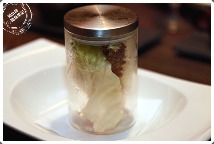 | 生菜放在玻璃搖搖慣裡面,試管跟玻璃罐都是先冰鎮的,看起來就相當的用心,沒意外清炙牛食創堂大概準備申請米其林美食了,我再很多米其林餐廳裡面都有發現這些小用心,擺盤+創意加上軟體服務,通常都會讓消費者眼睛為之一亮。 |