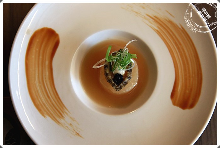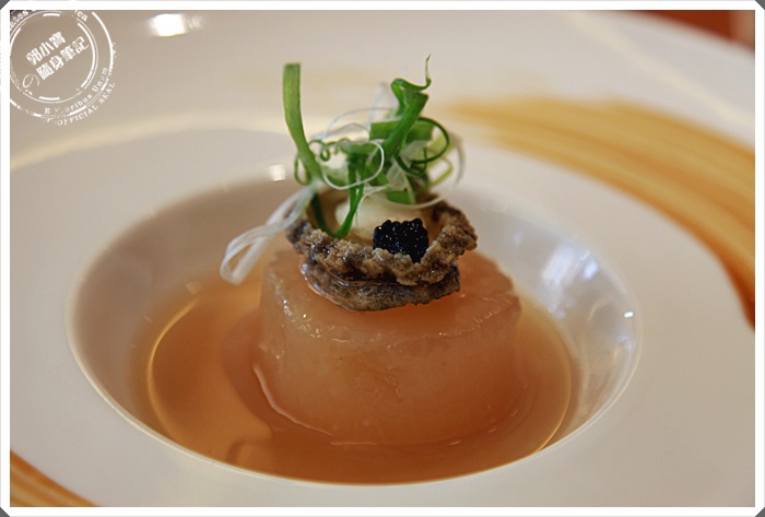 前菜一整個也相當的高級,上湯鮑魚魚子醬蘿蔔,湯汁以老母雞燉煮的上湯當為襯底,送上來的時候就可以聞到陣陣的香氣,鋪上一圈蘿蔔燉煮的並不會很軟爛,切下一塊入口滑口不會卡卡的,蘿蔔也吸附了相當多的上湯湯汁,重點是鮑魚旁邊還灑上了一小匙的魚子醬,這被歐洲稱為最高級的三珍之一,可以在牛肉麵店看到也算是一個奇杷了,魚子醬你可以選擇挑下來跟上湯一起豁著一起入口,歐洲幾乎都是跟湯或是夾麵包一起吃,但是我選擇一整塊鮑魚跟魚子醬一起入口。