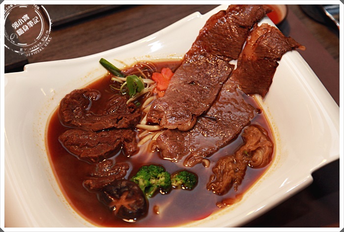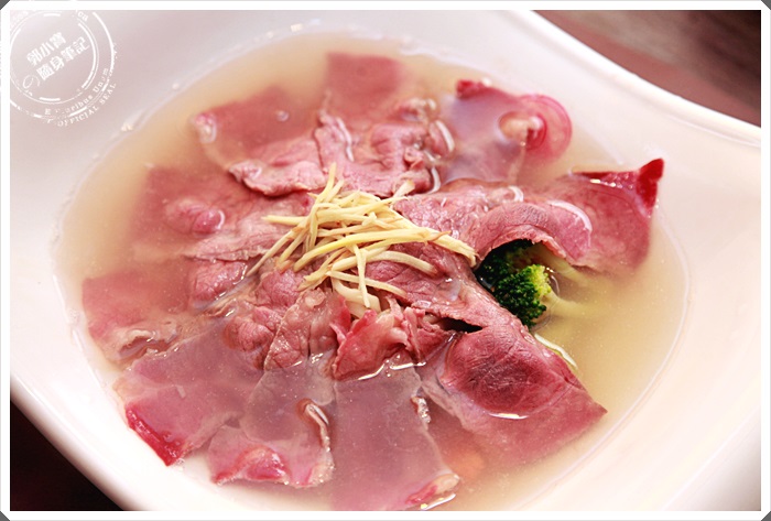 | 清燉牛肉麵上來的時候確實讓我驚豔了一下,老實說這兩碗麵我比較喜歡這一碗清燉牛肉麵,麵碗裡面大概放了10片的牛肉片,看起來不管是油花還是肉質都相當的不錯,我之所以會認為這邊的價位其實我覺得是可以接受的原因不外乎是我本來就都會去台南喝牛肉湯,一碗要價至少都要百元以上,炙牛食創堂的做法也有雷同之處,將熱湯汁淋入湯碗內讓生牛肉呈現粉嫩的熟度。 |