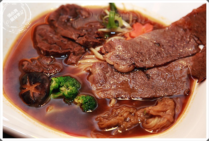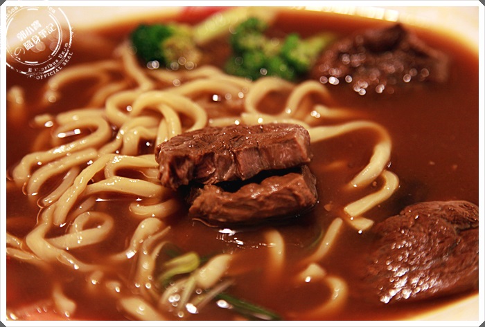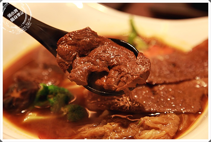 喝了一口湯頭,必須老實說這湯頭還滿特別的,看起來像是紅燒牛肉麵,但是卻沒有紅燒牛肉麵的重口味跟油膩,滿倒是相當的鮮甜清爽,通常大部份都會流行番茄入紅燒去解掉油膩感,但是這一碗牛肉麵湯頭卻是本身就相當的爽口了,喝到最後的時候感覺卻是甜的,整體來說很像是在西餐喝到的濃湯的甘口感。 |