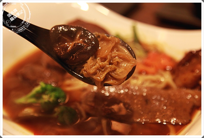 | 意外的發現了一件事,它們家雖然沒有酸菜,但是用山東白菜入湯頭,白色燉煮軟爛吸附了許多湯汁,一口咬下真的還滿搭口的,連香菇也都吸飽了湯汁,這兩個搭菜也跳脫了一般所認知的牛肉麵,尤其是山東白菜表現得相當搶分! |