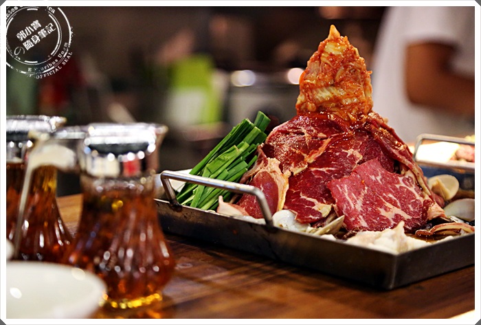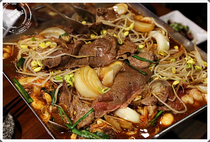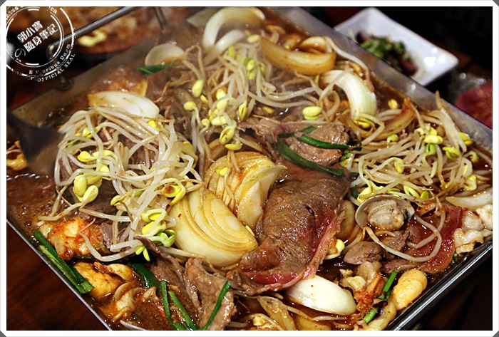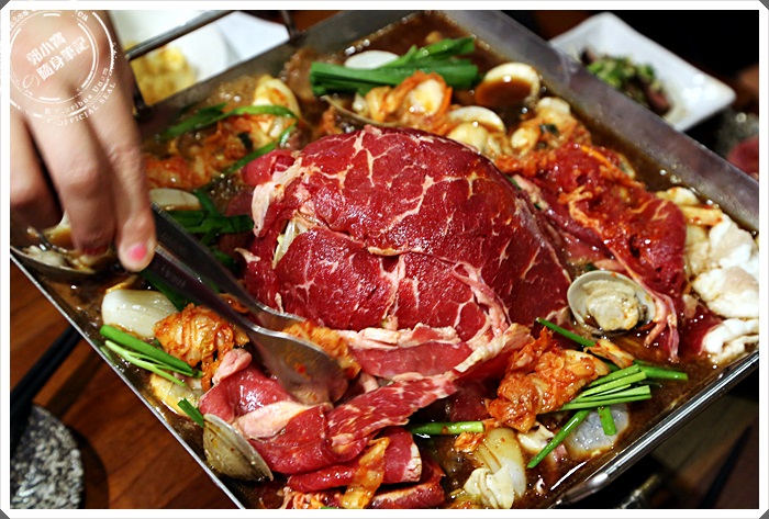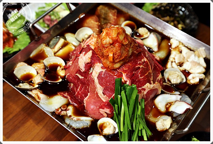 海陸大餐看起來就超豐富的,除了有牛肉以外,又加了一份海鮮平盆鍋,順時間整個平盆鍋都被的滿滿的好不豐富,在肉山的最上面還堆疊了小小的山的泡菜,說起平盆鍋的由來算是相當的奇妙,具工作人員仔細解說才知道,原來平盆鍋就是幾個韓國人在日本工作,想念家鄉的起司海鮮辣鍋,所以就結合了日本的壽喜燒鍋的方式,創造出這樣的平盆鍋,主要強調在醬汁的部分,利用大量的水果跟蔬菜熬煮,都是老闆自己手工熬煮出來的,單吃醬汁是甜的,但是吃完後不會有壽喜燒的鹹度感。 |