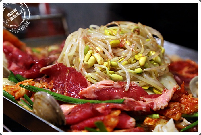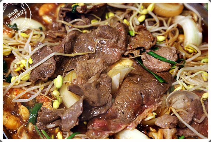 牛肉挑的還不錯,主要挑得沒有太多肥肉的油脂,讓牛肉沾滿了醬汁一起入口,第一口的感覺相當像是壽喜燒,但是沒有壽喜燒的死甜,口中散發著淡淡的果香芬芳,但是吃平盆鍋的其他食材時後就又是另外一種味道了,夾了一口豆芽跟菇類,入口卻是韓國泡菜鍋的味道,辣度會再後面慢慢的散發出來,真的超妙的!!!