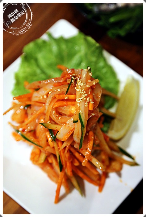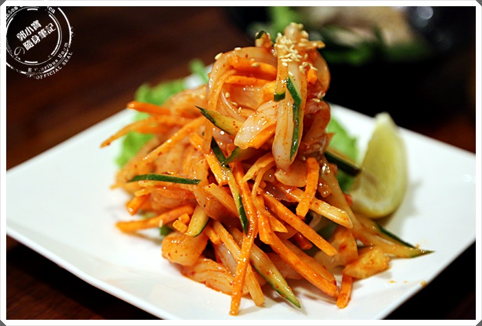 | 全部的涼菜裡面我最喜歡的就是這一道涼拌花枝,看起來就相當的開胃,相當道地的韓國涼菜,入口的辣度加上花枝的口感相當的搭,搭配生啤酒更是爽快! |