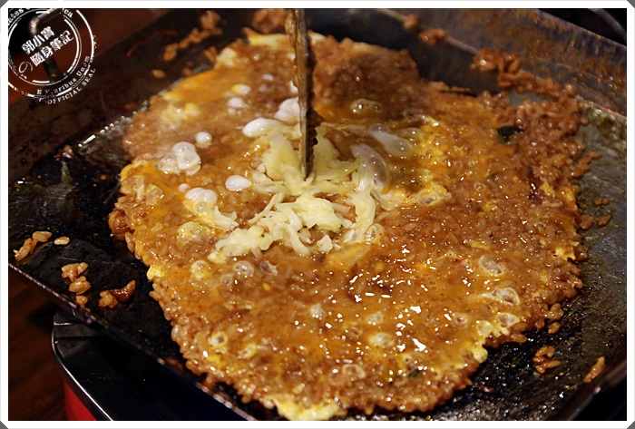| 烹煮鍋巴飯的時間大約是10分鐘左右,倒進白飯去作收汁的動作,加上金太郎特製的胡麻油跟起司、泡菜、最後再打個蛋花,看似簡單的流程做起來確實要很多的細節,幫我們做鍋巴飯的日本年輕人超認真的!!! |