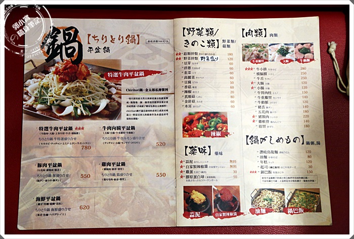 平盆鍋主要是店內的招牌菜,但是不是主要的經營項目,大部分還是以其他菜色為主,滿滿的四大頁的菜色,有兩面是屬於平盆鍋的部分,抑可以增加其他鍋底料。 |
