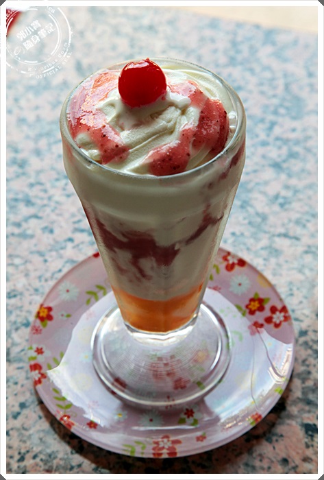 | 朋友點的,冰淇淋加上奶昔底層是水蜜桃,不過水果似乎都是罐頭水果,所以吃起來特別有古早味,冰涼順口,好久沒有吃過這類型的聖代了。 |