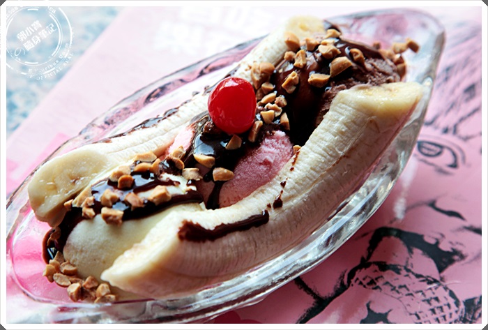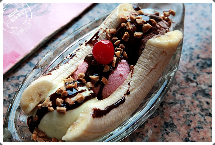 | 香蕉船在台灣也紅過一陣子,這邊的冰品真的是見證了台灣的冰品歷史,香蕉忠間夾著三種口味的冰淇淋,撒上堅果淋上巧克力醬,以前沒吃過香蕉船可就是沒跟上流行的說,大概有十幾年沒吃過了。 |
