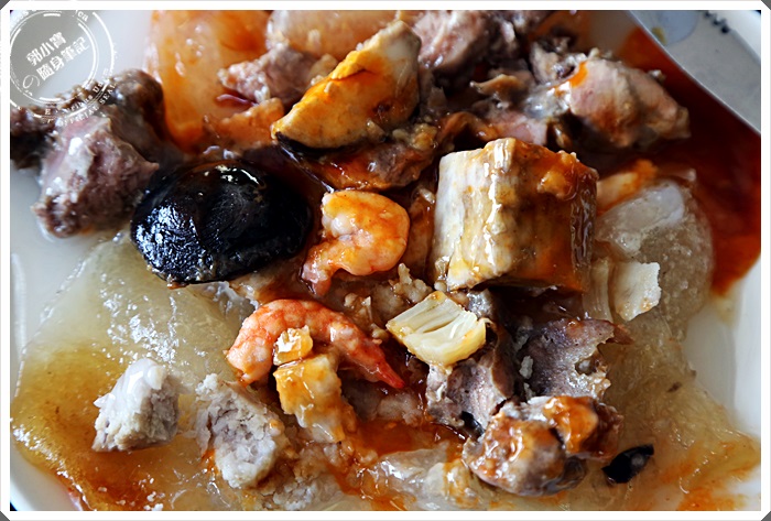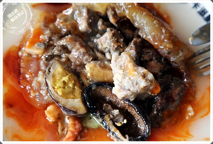看起來除了豬絞肉的肉塊以外還有香菇、滷蛋、芋頭、干貝、蝦仁,餡料確實相當的豐富,蝦仁看起來塊頭也相當的大。 |