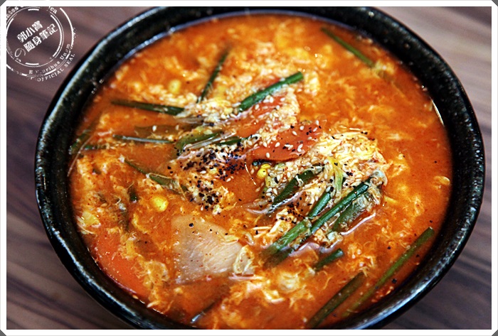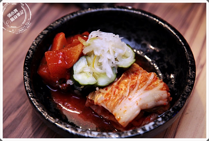 泡菜盛合辣度挺高的,不過整體上相當的特別,中間的泡菜還是台式泡菜,帶點甜甜的滋味瞬間被我們搶空,韓國泡菜辣度紮實,右邊的辣醃蘿蔔也很好吃。 |