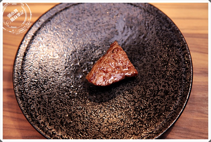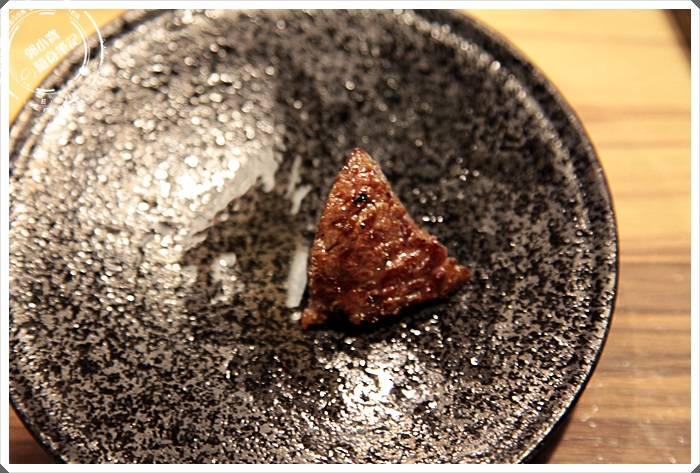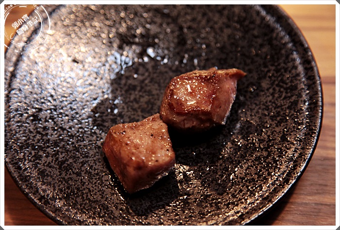 | 肋眼在廚房內日本師傅就已經分切好了,角切的一塊入口可以吃到那外皮的微焦香氣跟脆口,裡面的肉汁當場就噴發出來,外脆內嫩的口感讓我超喜歡的。 |