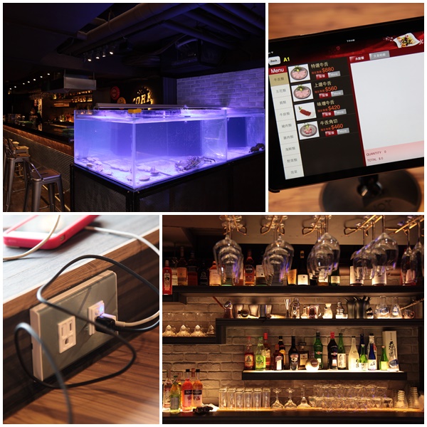 | 店內每張桌子都有超貼心的小設計,有兩個USB充電插孔跟一個110伏特的電源插孔,對於每次坐下來就要替手機充電的我們超方便,約客頂級和牛燒肉全店都是使用無線平板電腦點餐,操作相當的簡單方便,且都還有品項的說明文字跟照片,令人感覺到很特別的還有兩個超低溫的水箱,裡面都是活跳跳的生猛海鮮,來這邊也可以享受生猛帝王蟹跟龍蝦,旁邊還有一個超時尚的小酒吧,販售很多調酒料跟無酒精飲料,真的算是顛覆了燒肉店的刻板印象了。 |