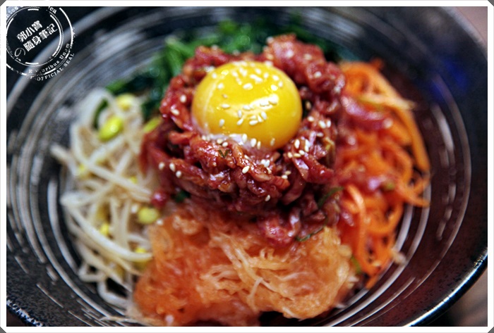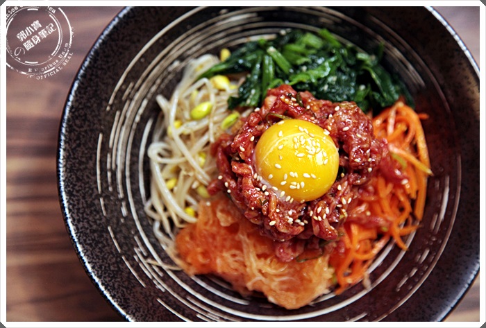 | 獲得大家一致好評的生牛肉拌飯,生牛肉條先醃製過,加上泡菜、醃蘿蔔絲、豆芽等疏食,打上一顆生蛋黃拌完後、看起來不怎麼起眼的拌飯卻是讓大家驚呼連連,入口有很濃郁的蛋黃香氣,滋味帶點酸鹹加上蔬菜的水分真的超好吃的。 |