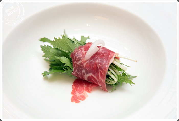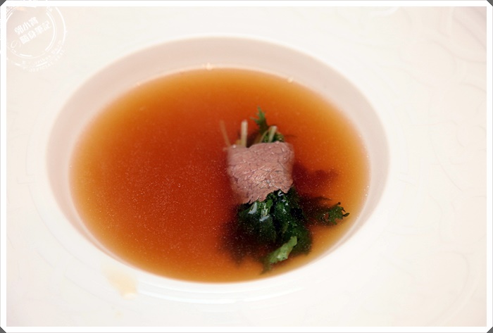這一道湯品程序就比一般的湯品來的複雜許多,剛送上來的時候只有一個空盤跟牛肉捲食蔬。