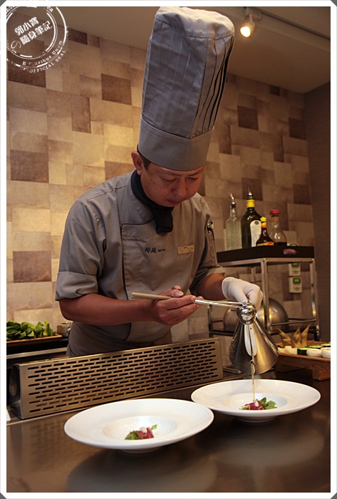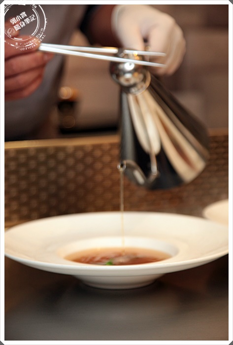 | 江主廚將現場熬好的高湯倒入牛肉空盤上,倒入高湯的時候我就聞到了一股淡淡的香氣了。 |