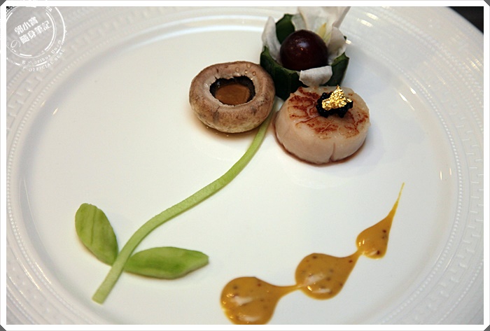 江主廚每道菜都像是作畫一樣,即使只為了呈現出黃金干貝,還搭配了也很出色的蘑菇跟角瓜。