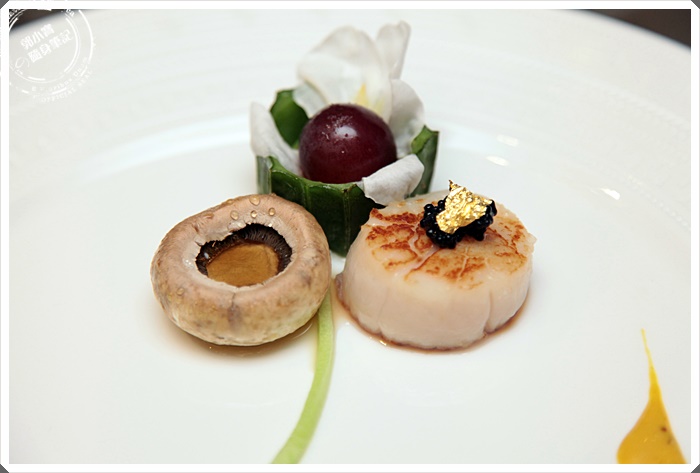 | 半熟的黃金干貝是生食等級,一口咬下真的汁多飽口,蘑菇湯汁鮮甜,咀嚼中散發的蘑菇自然的香甜。另一個我覺得很厲害的就是角瓜去皮後夾著葡萄跟蘭花一起入口,蘭香濃郁、葡萄香甜、角瓜汁多,一起入口的層次變化相當的豐富。 |