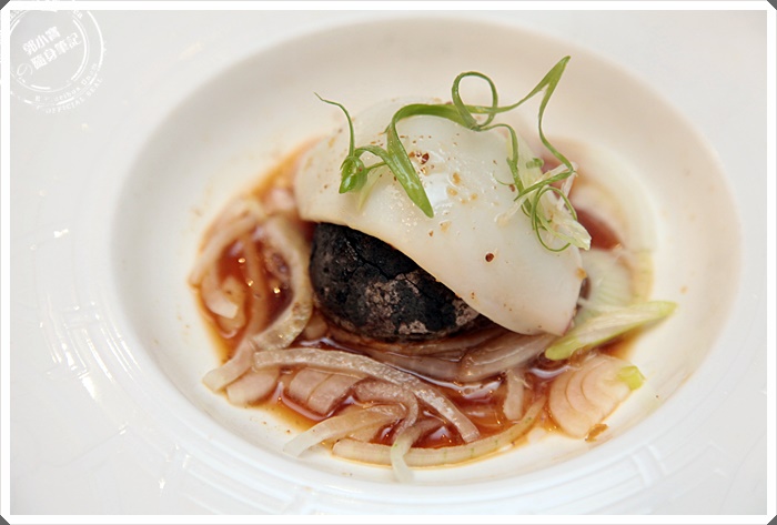 澎湖每天新鮮空運來台的小卷,江主廚用台灣鵝卵石燒到360度的高溫後,然後將小卷放在石頭上,要注意別放太久以免過熟,達到你喜歡的熟度後就可以夾取了,一口吃下也是新鮮滿分,那彈口的小卷肉搭配著洋蔥醬汁真的很搭。 |