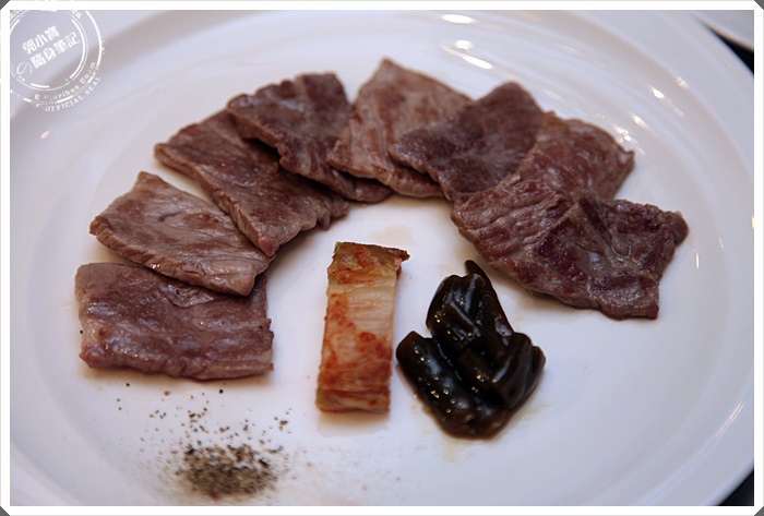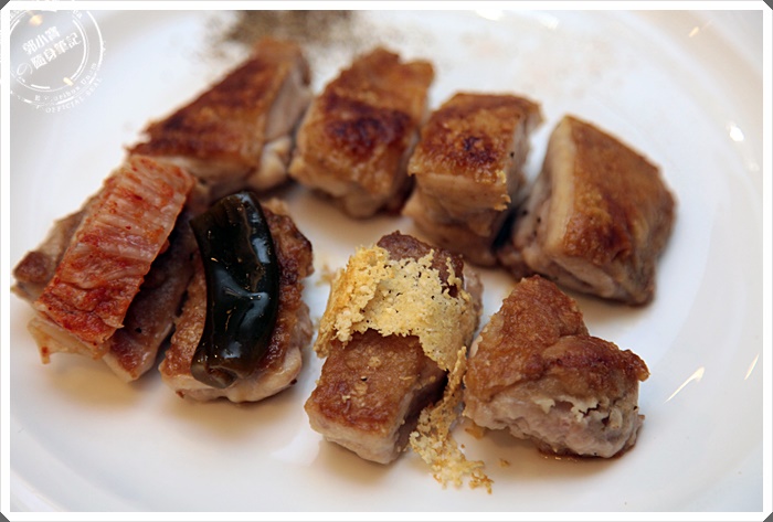 江主廚說豬肉是特別到深坑找的肉商,這一家的豬肉通常早上10點前就被搶售一空了,很多名牌餐廳都是特地來這邊採購,煎到有點赤焦入口嚼起來相當的香,有種讓人忍不住一片接著一片的感覺,原味就相當的好吃了,我覺得極黑豬搭配泡菜或是剝皮辣椒反而會有過多,吃原味最推薦! |
