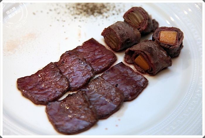 | 江主廚將牛肉中間放了水果這舉動讓我們滿驚訝的,從沒想過牛肉上面搭配水果。 |