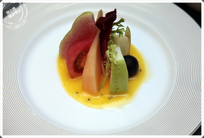 | 本來是湯品後面要上的莎拉放到最後再上,水果都挑的很好,每一種都很甜,特別的是芭樂是西瓜芭樂,這品種還是第一次吃到,本以為是紅心芭樂呢,醬汁也很特別,是用火龍果跟鳳梨調出來的,整體來說算是相當搭口的水果沙拉。 |