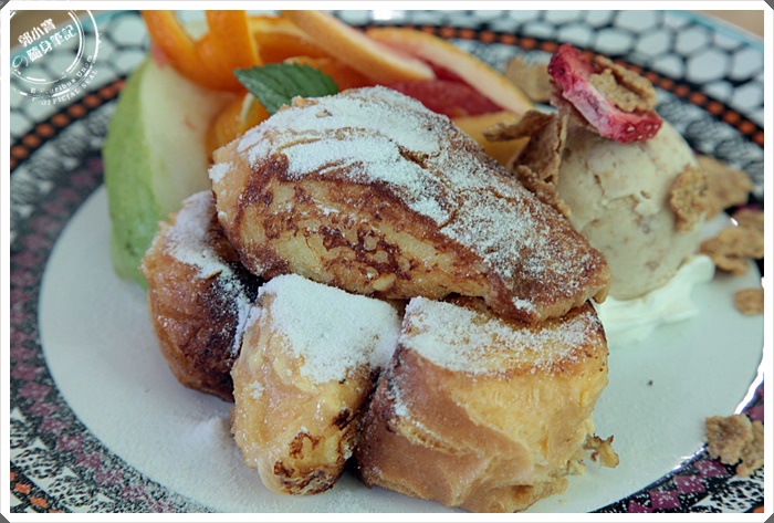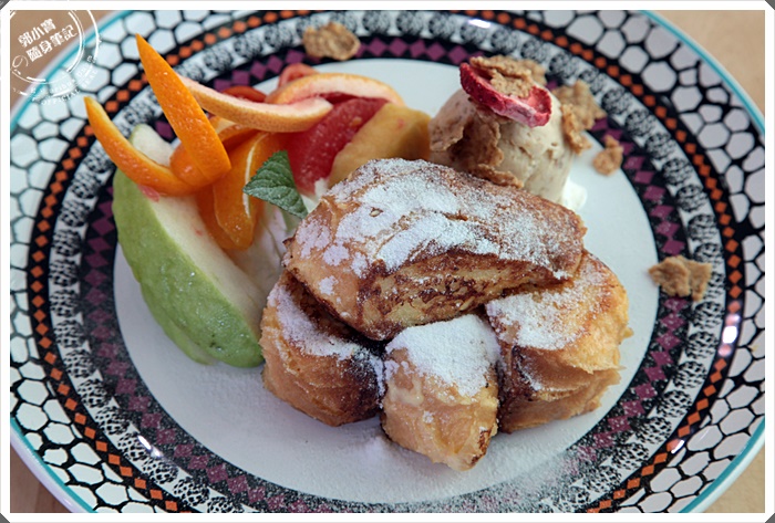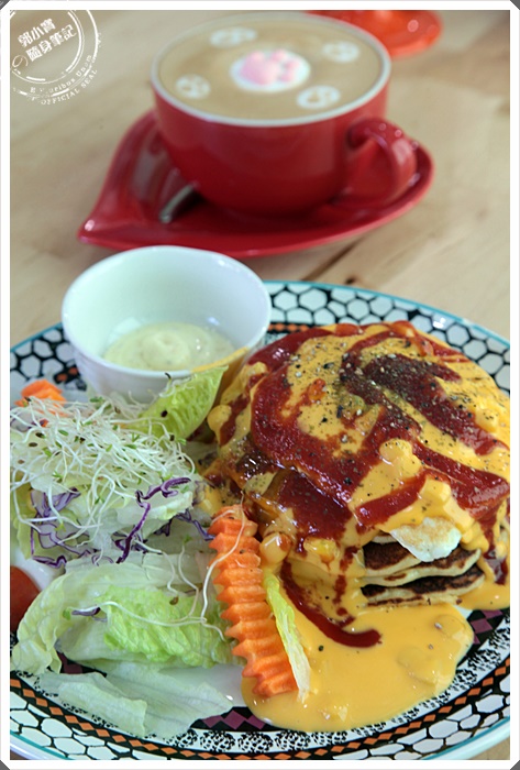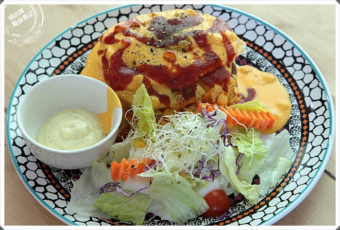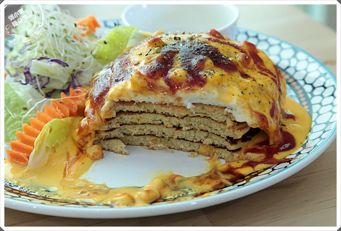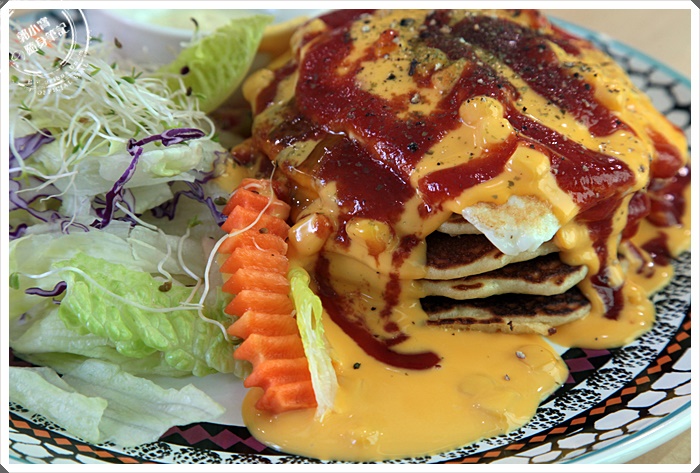 | 還滿推薦給男生的,看菜單看了一輪後,大概只有鹹起司這組合可以進入我的眼內,堆疊的鬆餅裡面有荷包蛋跟四片鬆餅,上面淋了大量的鹹起司,還有一些生菜,生菜水分略少了一點,甜醬的部分很普通。 |
