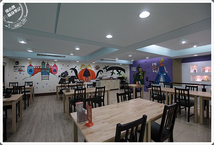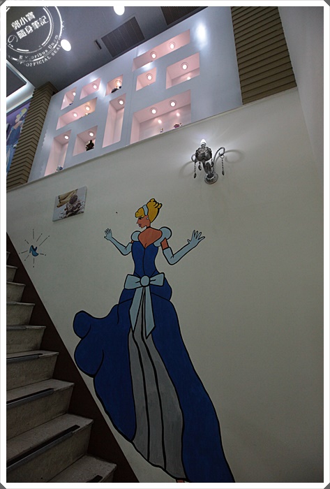 | 沿著樓梯走到了二樓,樓梯跟二樓牆壁大量繪製了許多仙杜瑞拉的壁畫,但是我覺得還是有一些地方不是很足,這樣稱為主題餐廳似乎有一些薄弱,二樓座位相當多,且桌子與桌子的空間夠大,即使坐滿人應該也不會覺得擁擠,算是有良好的用餐環境。 |