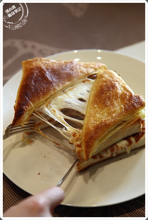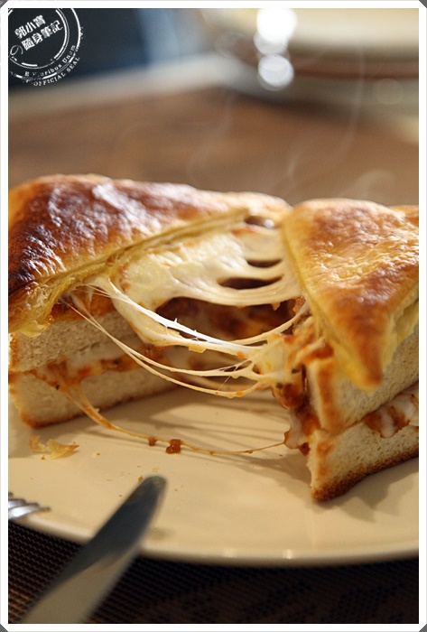 | 切開後可以看到最上層的起司牽絲融化的模樣,吐私是厚片土司,中間夾著番茄肉醬,一口咬下相當的有滿口感,最上層的酥皮加上鬆軟的吐司,中間的肉醬鹹酸滋味搭配起司超搭,有點濕潤感浸濕了吐司相當的美味,重點要趁熱吃最美味。 |