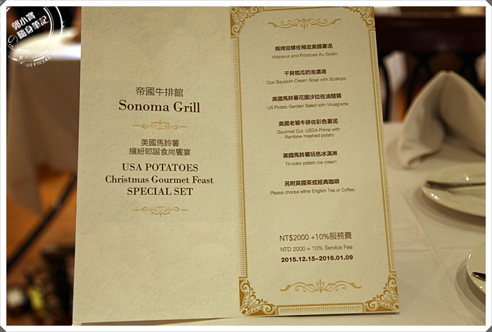 | 這次來帝國牛排館就是為了親眼看主廚怎麼把配角變成主角,美國馬鈴薯可以玩出甚麼新花樣,帝國牛排館本身的知名度就很高了,據說牛排裡面等級最夢幻的老饕牛排就是從帝國牛排館出來的,加上他同時也是很多政商名流的最愛,所以這次馬鈴薯可以跟帝國牛排館合作推出聖誕大餐真的相當的難得,機會只有在12/15~2016/01/09之間可以點的到,千錯別錯過這難得的聖誕大餐。 |