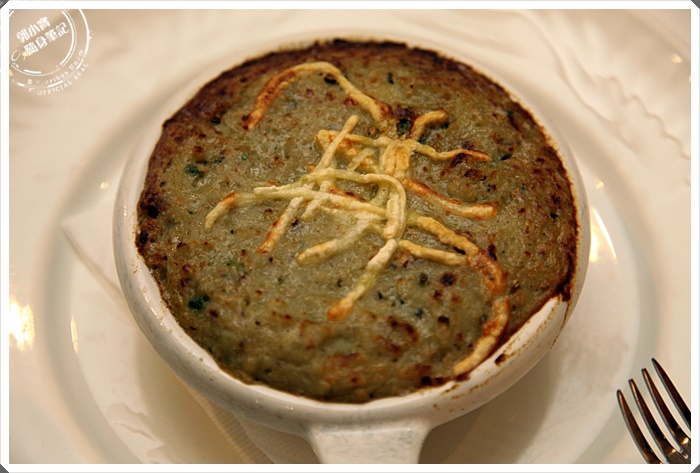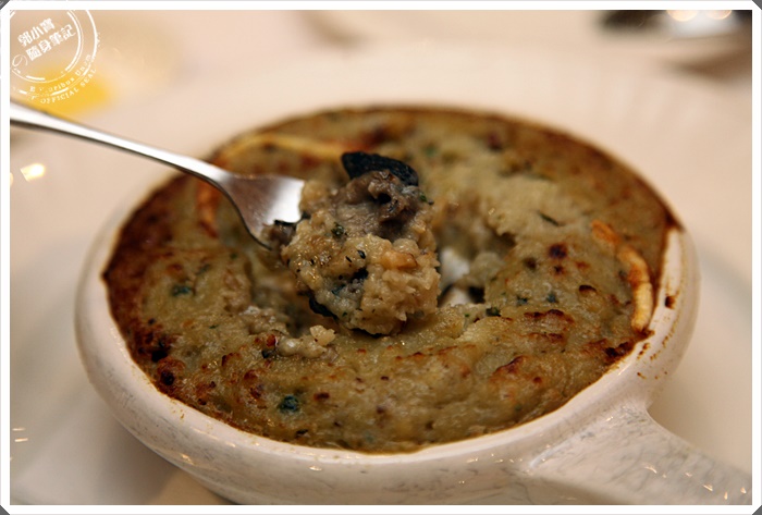 | 這一道前菜著實驚艷了我,那入口綿密的口感加上淡淡的濃香氣,一往裡面挖還發現了田螺,頗有驚喜感,本以為是全部都是馬鈴薯泥,田螺相當的鮮甜水分又多,當田螺的汁被馬鈴薯泥吸收後加上起司條整體大加分,超特別的一道前菜。 |