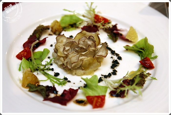 將馬鈴薯切片後拿去烘烤製作成花瓣,吃起來酥脆可口,伴著底下酸甜滋味的薯泥打漿相當特別,那口感有點濕軟加上酥脆。 |