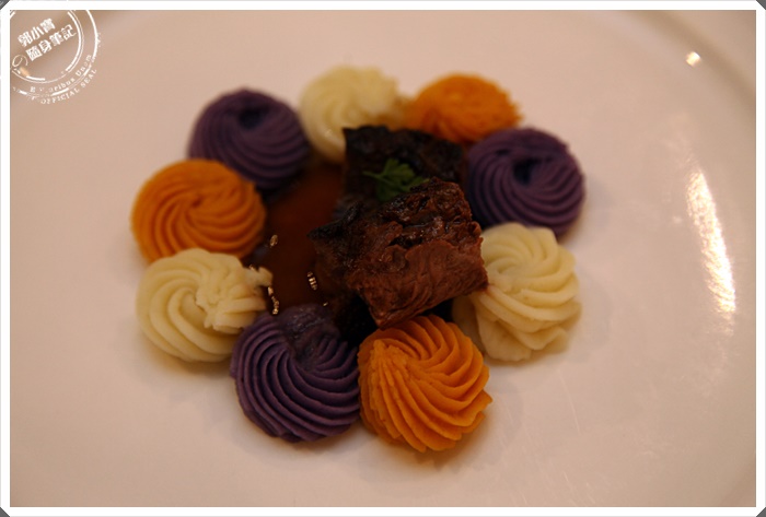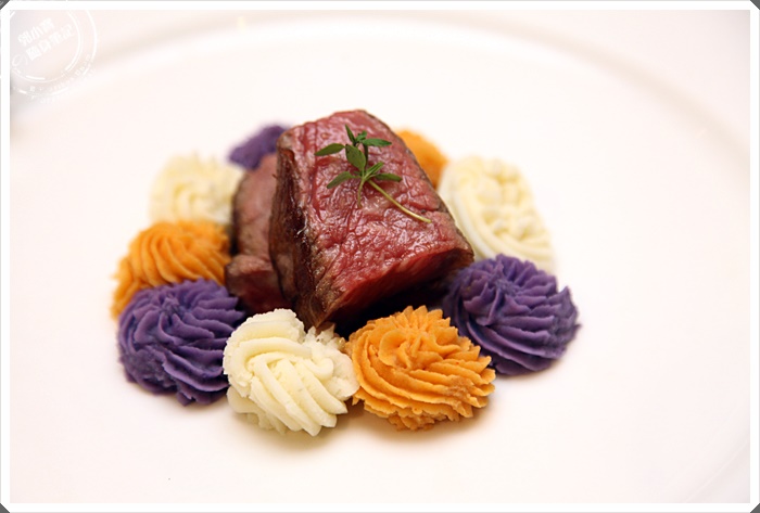 | 牛肉還沒好,但是主餐的另一個主角卻已經再等待了,真的是美道不像話,馬鈴薯泥可以有這麼繽紛的顏色加上擠出一朵朵小花的感覺,不說我真會以為旁邊是奶油咧!! |