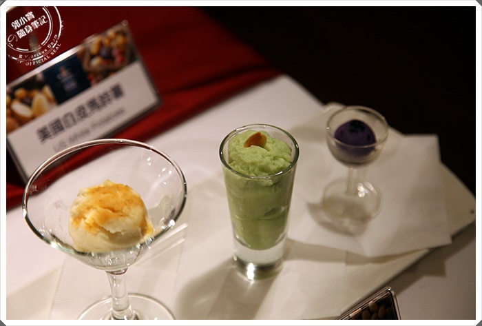 最後的冰淇淋也很特別,一樣是陳主廚拿手的將三個元素混搭再一起,每咀嚼一口都有不一樣的滋味,最大的那個我個人吃起來滿像花生冰淇淋的,但是又帶著濃郁奶味,真的相當特別,紫色的是偏酸甜口感,是馬鈴薯加了芋頭還有馬鈴薯,真的很有創意的神師傅,至於綠色的更是特別,本為是香草口味之類的,沒想到卻是酸酸的九層塔口味,九層塔的香氣搭配酸甜滋味,整個大開心!!!!