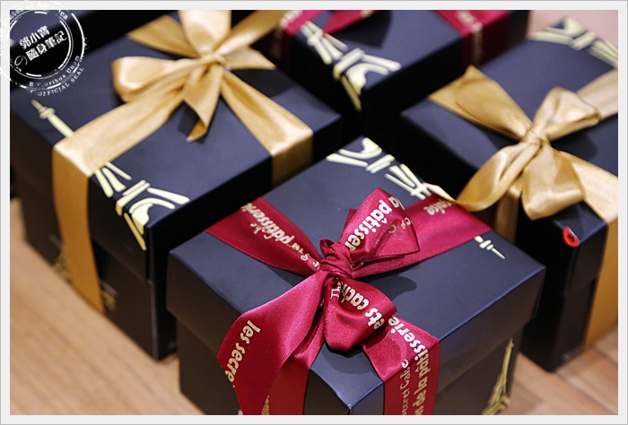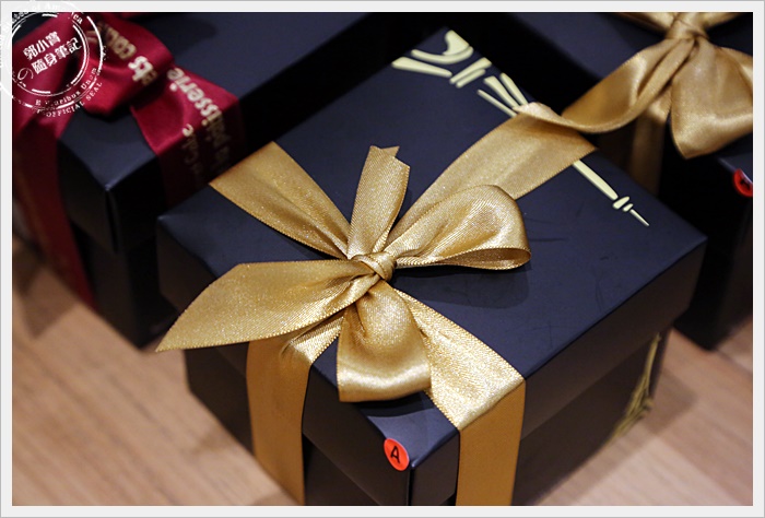 | 點了四款以後,工作人員拿給我門外帶盒,這外帶盒也太漂亮了吧,外層還用緞帶綁了起來,還沒吃就讓心情整個大好,在期待甜點慢慢拆開緞帶的那段時間,就是一段準備享受美味甜點的美好時光了,這包裝也真的是不輸給日本了,相當的用心。 |