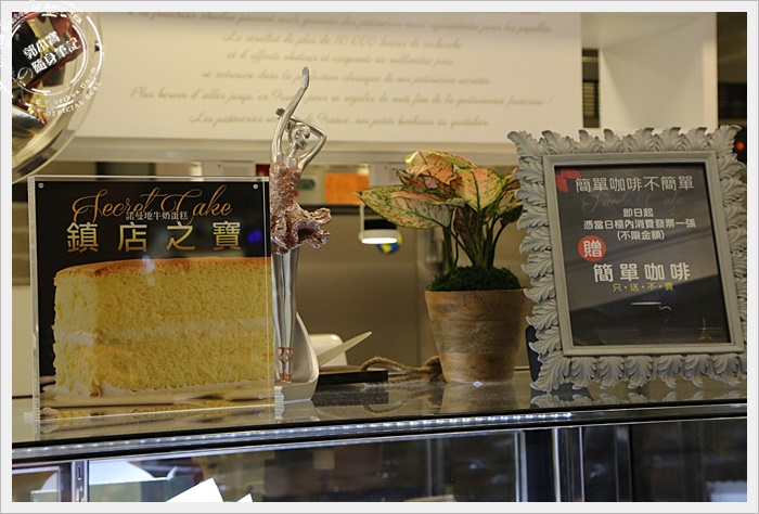 | 仔細一問才知道法國的秘密甜點是台灣廠商,說真的還沒吃到以前真心覺得他們有些貴,鎮店之寶諾曼地牛奶蛋糕,當初就是以這一道甜點聞名的,旁邊另一個立招是只要店內消費就可以獲得免費咖啡一杯,超大氣! |