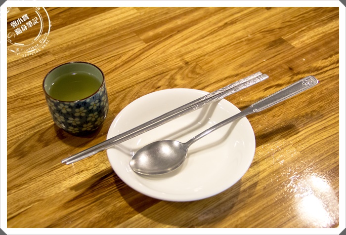 | 不例外的,店內使用濃濃韓國味的長扁筷跟長湯匙,也會附上一杯玉米鬚茶! |
